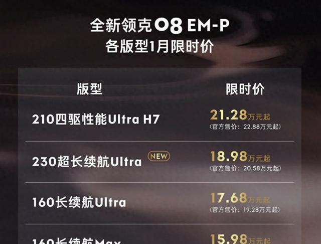 外观设计上,新车延续领克08 EM-P家族经典的“都市对立美学”设计语言,整体造型时尚动感且极具辨识度。前脸配备贯穿式“北极之光”LED日行灯,搭配大尺寸无边界格栅,格栅内部辅以点阵式光影元素,营造出强烈的科技感。车身侧面采用溜背式轿跑造型,流畅的腰线从车头延伸至车尾,搭配20英寸多辐式运动轮毂与红色刹车卡钳,运动质感拉满。车尾配备贯穿式“能量晶体”LED尾灯,搭配双边共四出排气布局与小型扰流板,整体设计兼顾时尚感与性能气息。
